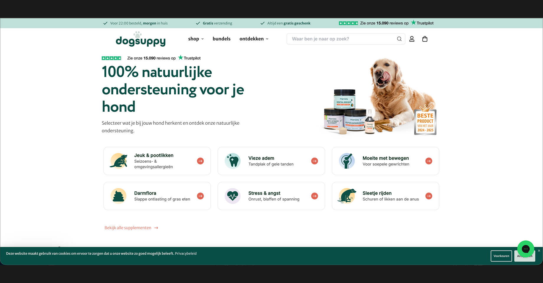 Voor DogSuppy, een snelgroeiend premium merk in hondensupplementen, trad ik als Shopify CRO expert op binnen een Shopify Plus traject. Focus: checkout-optimalisatie, hogere conversie en een schaalbare direct-to-consumer funnel.