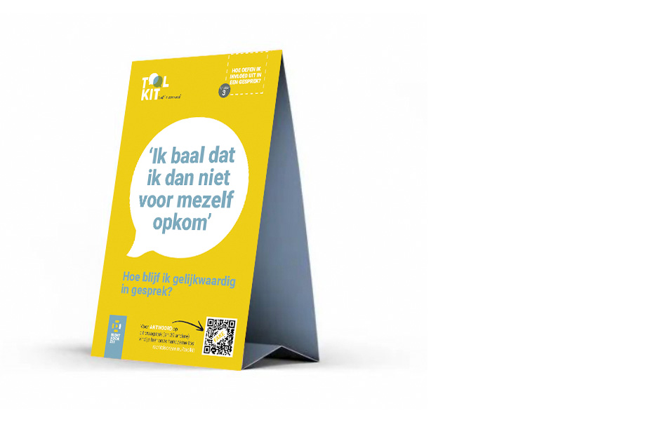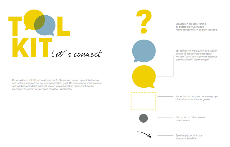 Ik heb een logo ontworpen rondom het woord TOOLKIT, waarbij de twee O’s als spraakballonnen zijn vormgegeven, wat direct aangeeft dat het om gesprekken gaat. De transparante overlap symboliseert dat je door in gesprek te gaan met verschillende meningen en perspectieven tot een positief resultaat kunt komen. Dit alles uitgewerkt in verschillende uitingen.