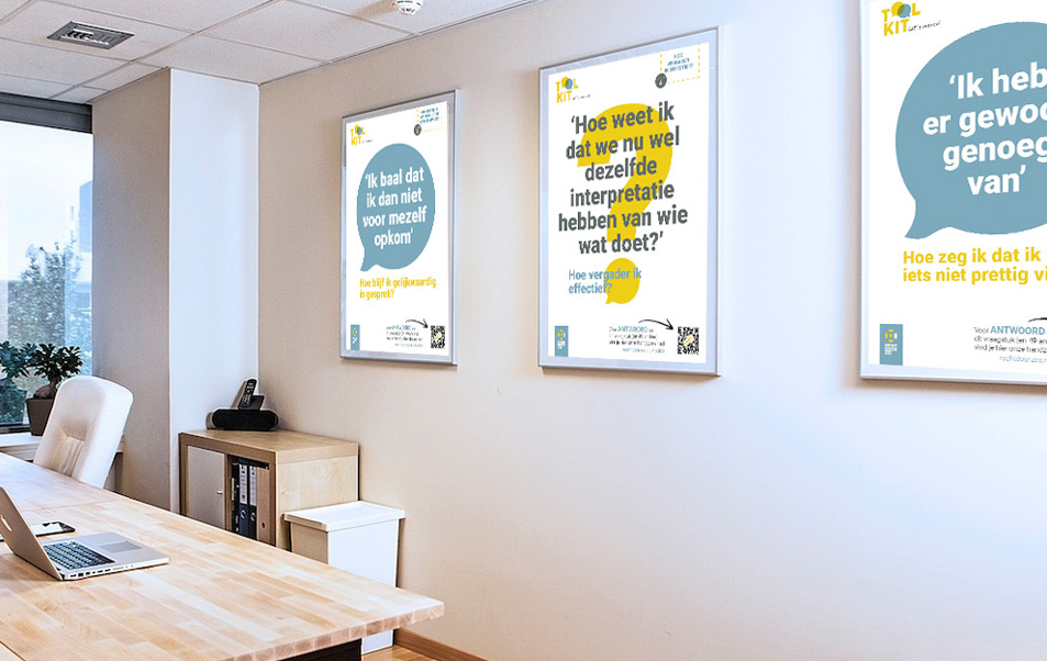 Voor Rechtdoorzee ontwierp ik de visuele identiteit voor de Conversation ToolKit: praktische gidsen die een specifieke gespreksvaardigheid stap voor stap uitleggen. Met een Conversation ToolKit laat je als werkgever zien dat je het belangrijk vindt om naar de stem van jouw medewerkers te luisteren en dat je begrijpt dat zij soms ondersteuning nodig hebben om zich uit te drukken.