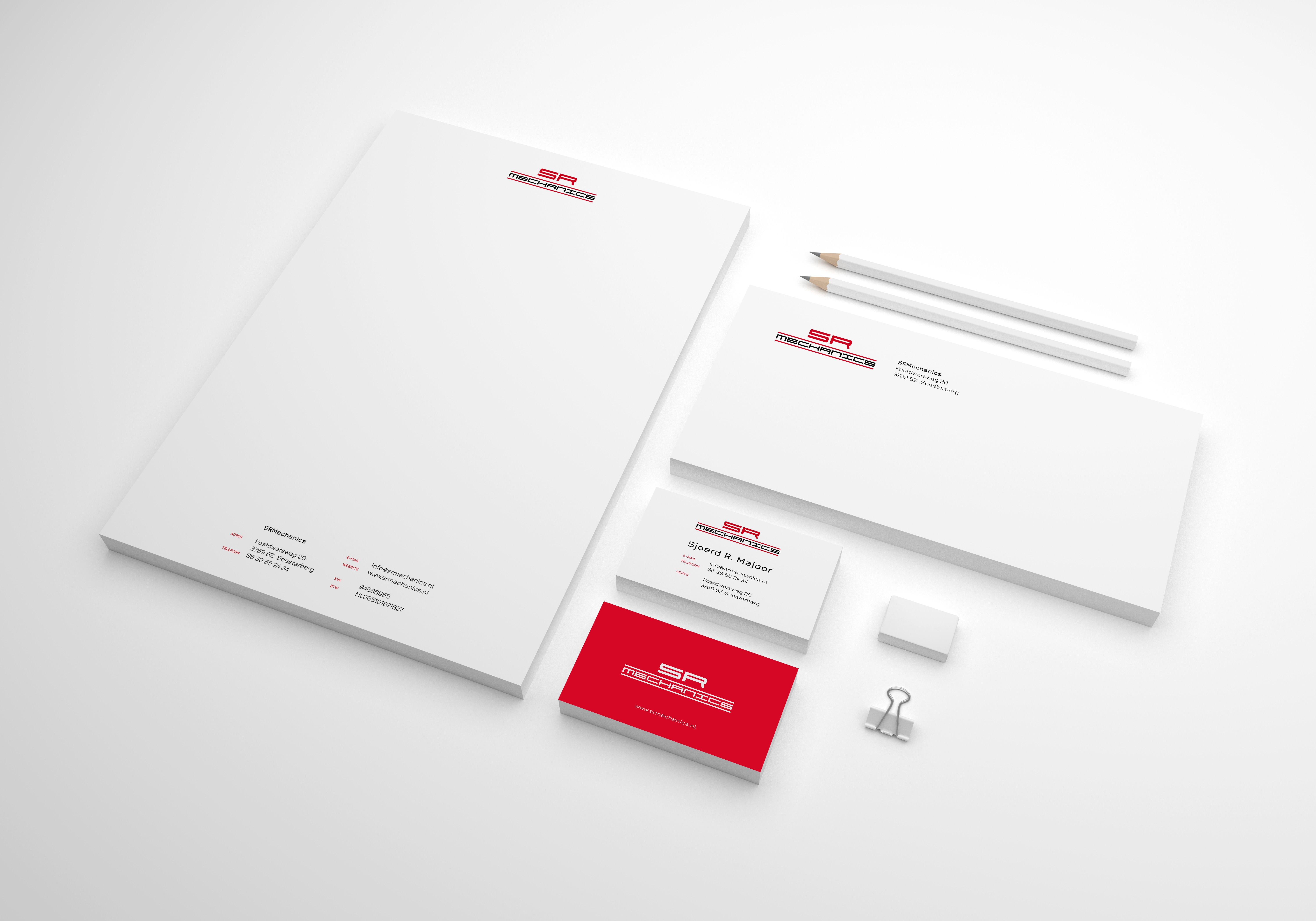 Voor een startende ondernemer ben ik gevraagd om een logo & huisstijl te ontwikkelen. SRMechanics is een handelsbedrijf in brommers en motoren. Zijn persoonlijke liefde voor Porsche moest terugkomen in zijn eigen logo. Het herkenbare lettertype voldeed helaas niet aan mijn kwaliteitseisen en daarom heb ik de letters handmatig getekend. Dat is dan weer mijn liefde voor het vak!