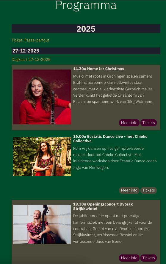 Verbeteringen in het grafische en UX (User Experience) ontwerp en een nieuwe programmamodule voor een muziekfestival op een Worpress web site. Ik heb een nieuwe header en footer gemaakt en een programmamodule waarmee je gemakkelijk een programma voor een muziekfestival kunt samenstellen. Nieuwe functionaliteiten zoals:Programma Een module om een programma voor een muziekfestival makkelijk te maken met een duidelijke grafische vormgeving en een goede gebruikerservaring (UX)Video in de header Een header en menu op de homepage