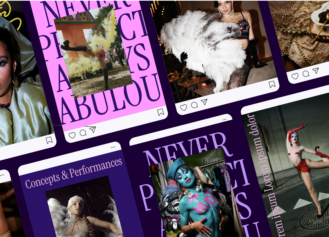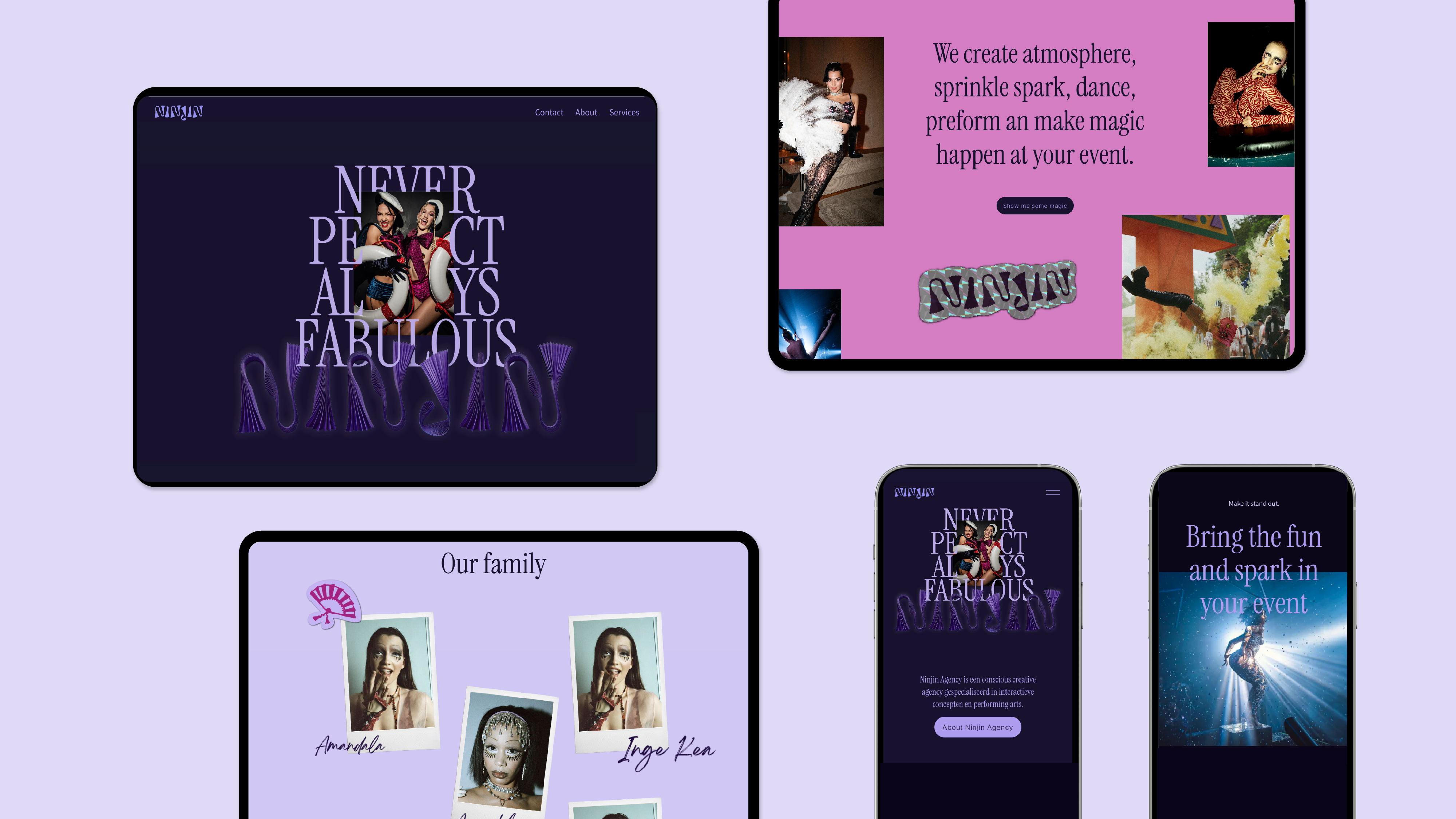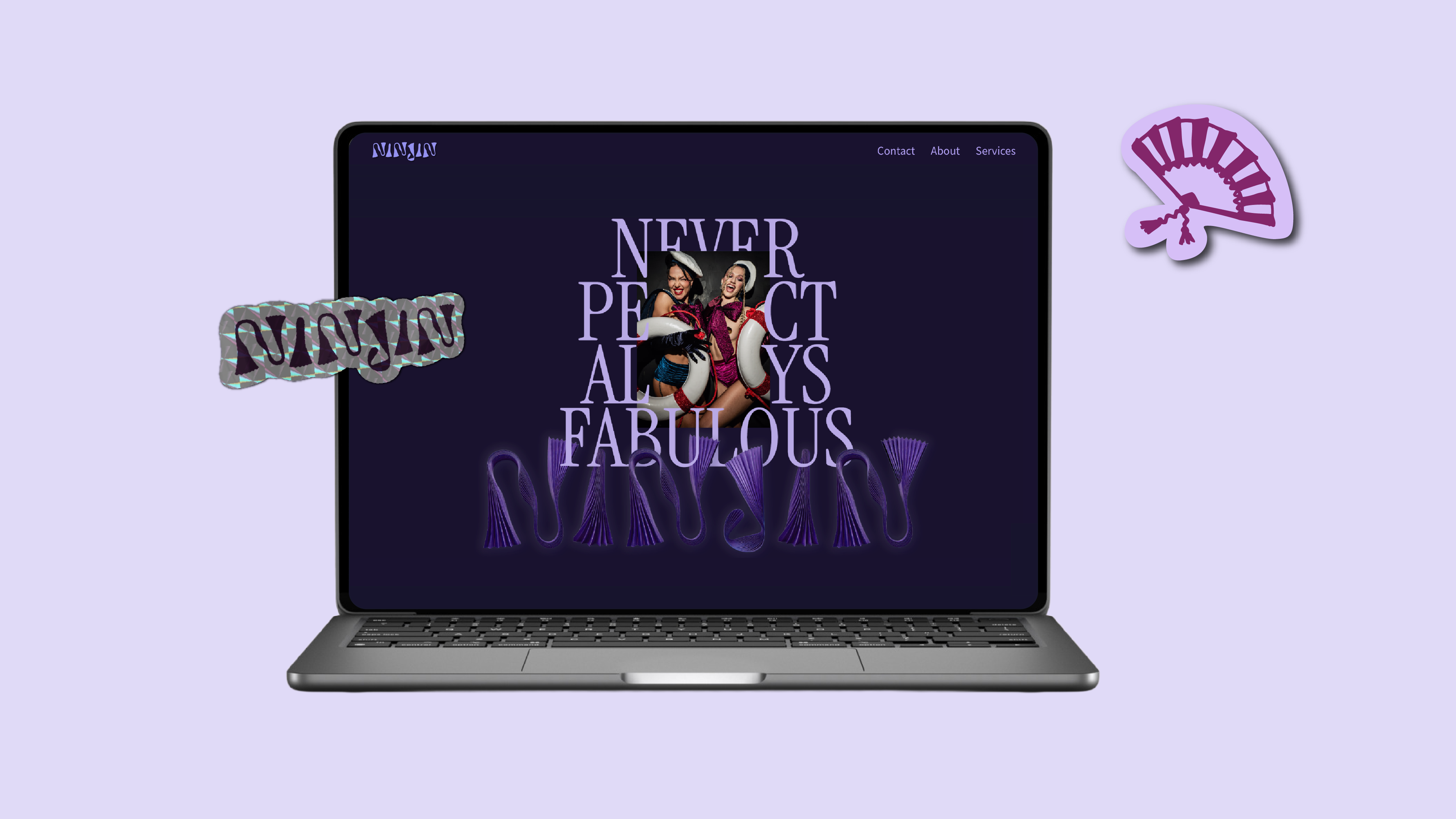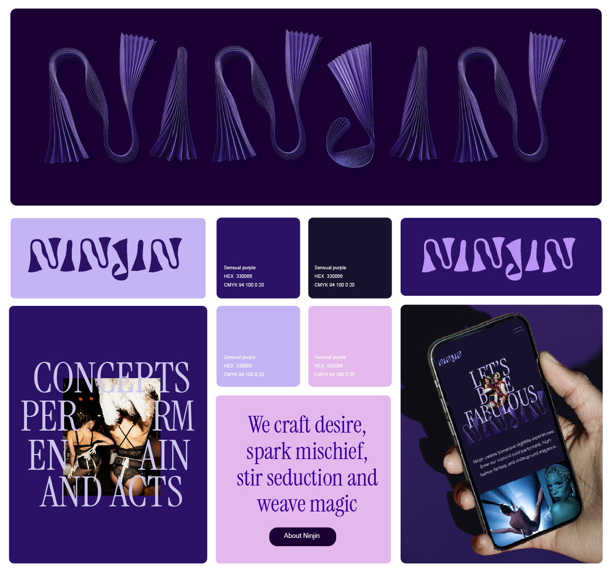 Geïnspireerd op de vorm van waaiers en als symbool voor beweging en show ontwierp ik een typografisch beeldmerk. Daarnaast maakte ik een secundair simpeler breder inzetbaar logo voor social media, dat flexibel inzetbaar is: de textuur van de binnenkant kan gevuld worden met holografische effecten en glitter. Zo wordt de branding net zo veelzijdig en fluide als het werk van werk van Ninjin zelf. Ik ontwierp en maakte ik de website van Ninjin volledig in de nieuwe branding.
